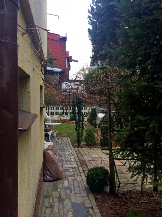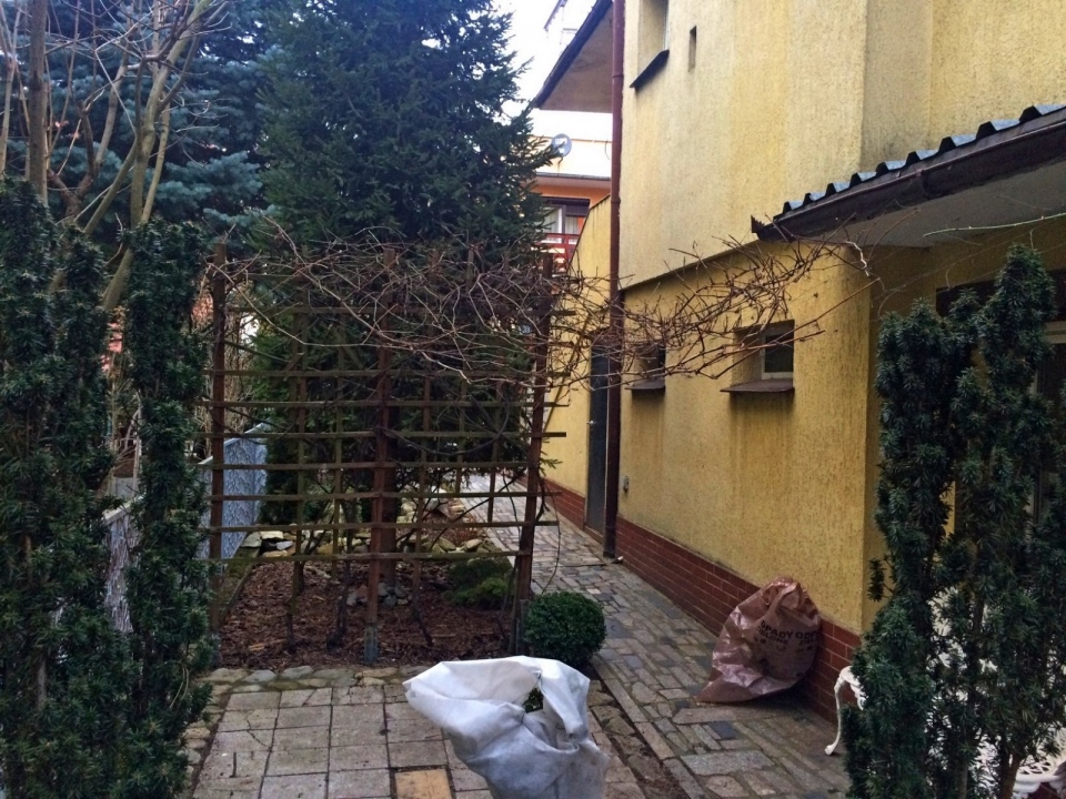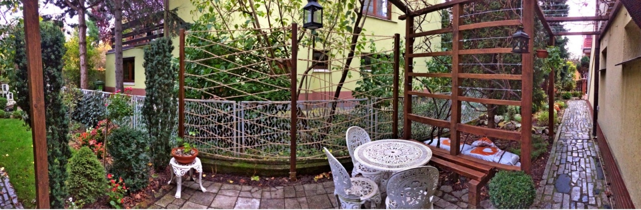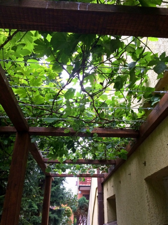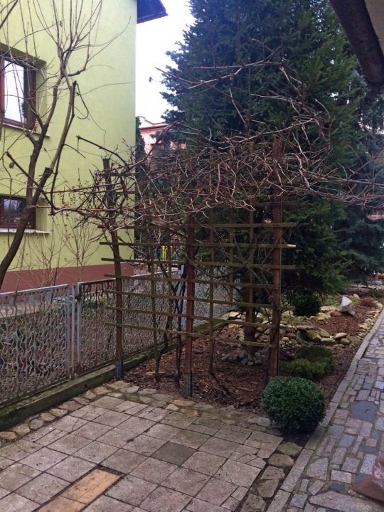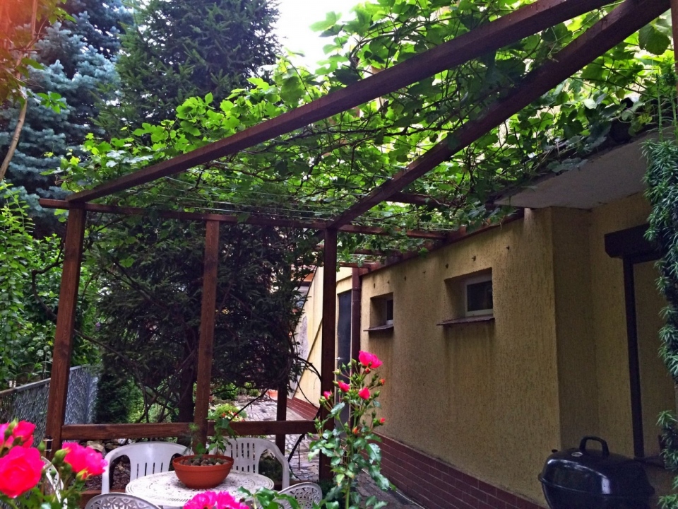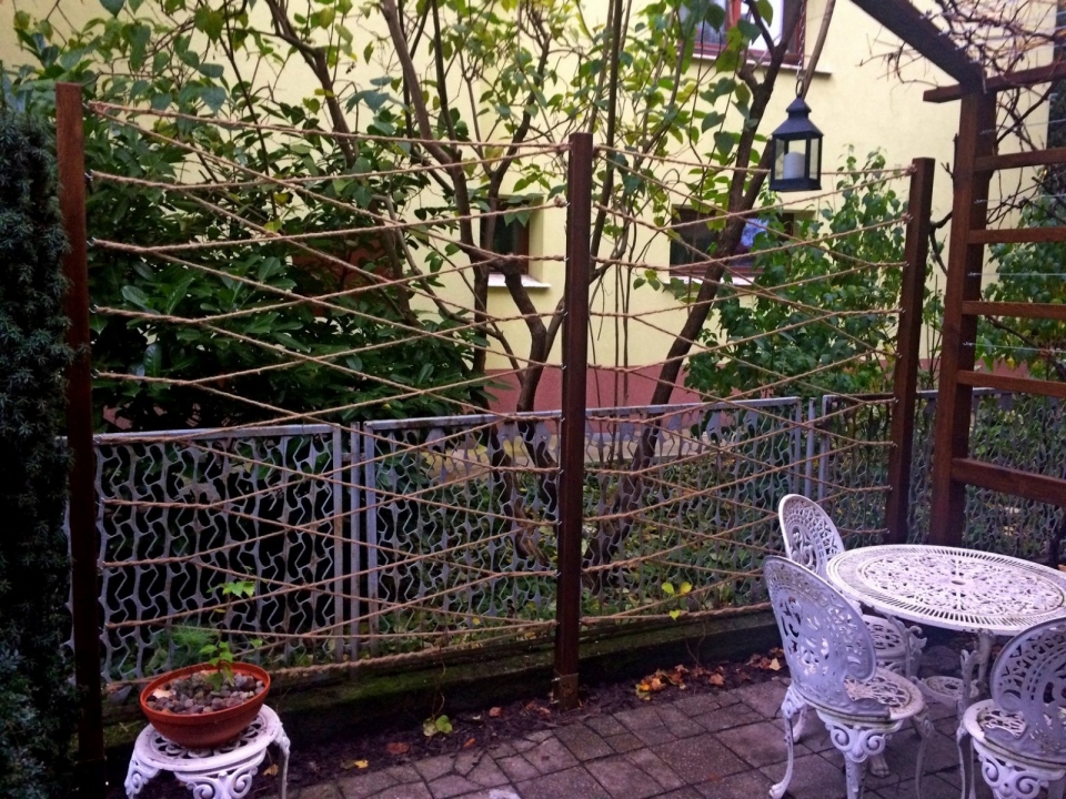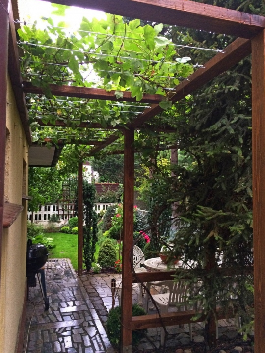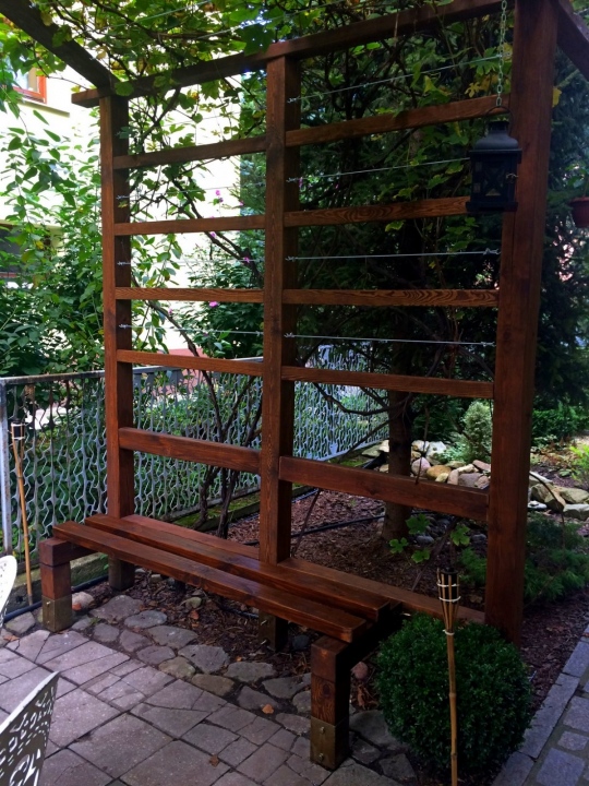 Modernistyczna pergola z ławeczką dla winorośli oraz luźna konstrukcja dla winobluszczu trójklapowego w formie naturalnej ściany.